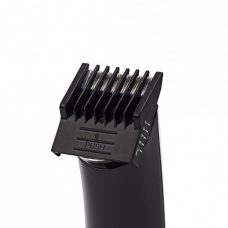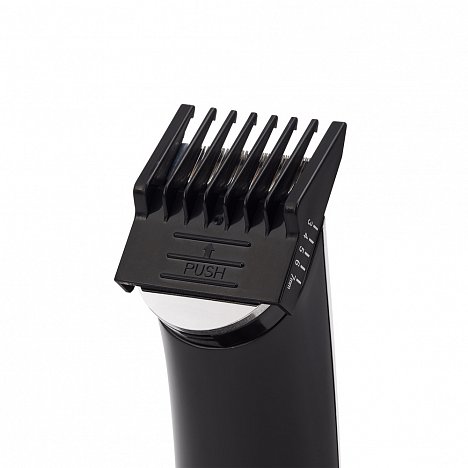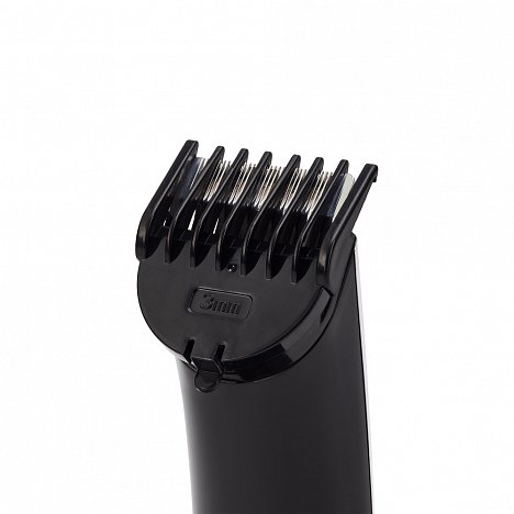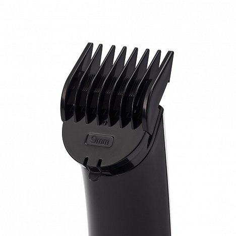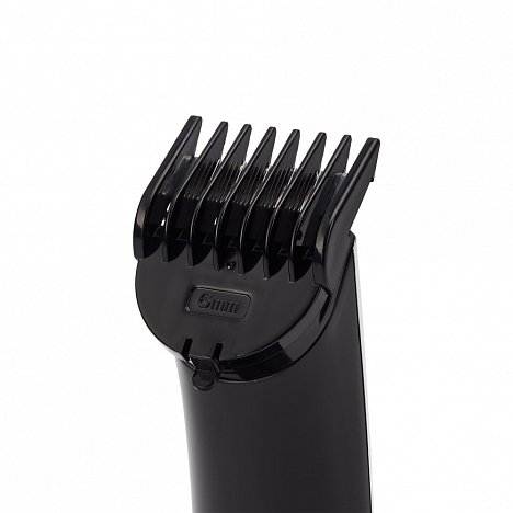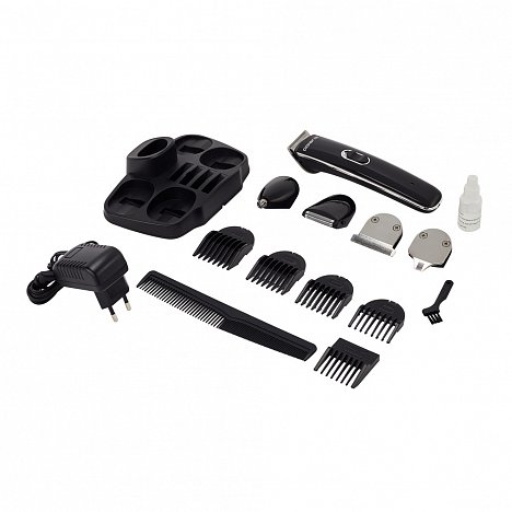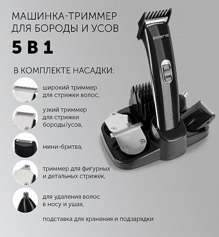 В комплекте насадки: широкий триммер для стрижки волос (3-12 мм), узкий триммер для стрижки бороды/усов, мини-бритва, триммер для фигурных и детальных стрижек, для удаления волос в носу и ушах, подставка для хранения и подзарядки.
