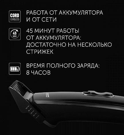 45 минут работы от аккумулятора: достаточно на несколько стрижек.
